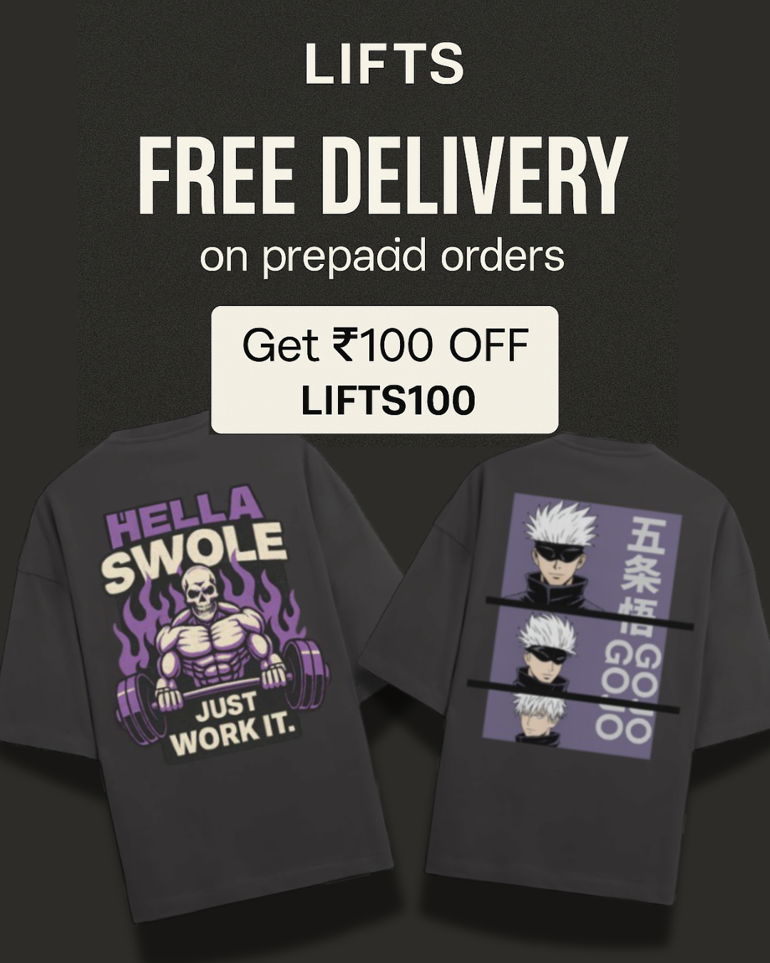LIFTS is giving you FREE DELIVERY on all prepaid orders + ₹100 OFF with code LIFTS100! Whether you're lifting heavy or flexing anime vibes, grab your favourite oversized tees now — because deals like this don’t wait! 💪👕